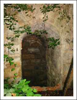 Durch das Gebäude führt ein Gang in einen Hof, der jetzt von Büschen