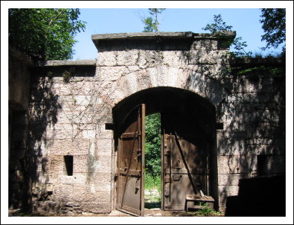 Der Torbogen des Eingangs, links der Kehlkoffer mit den Schießscharten