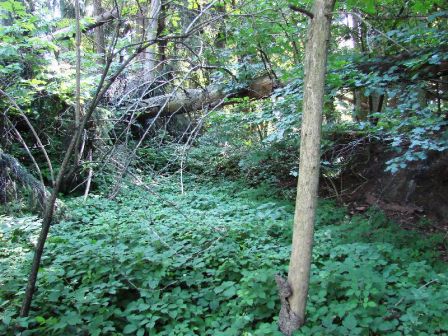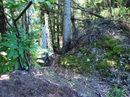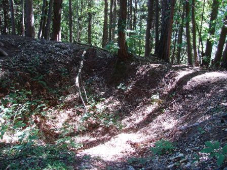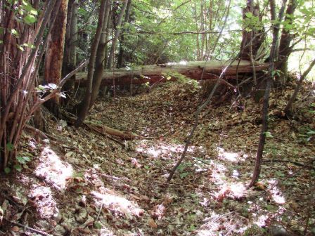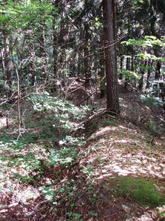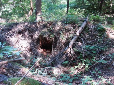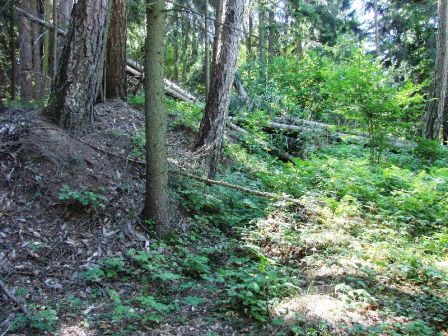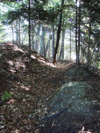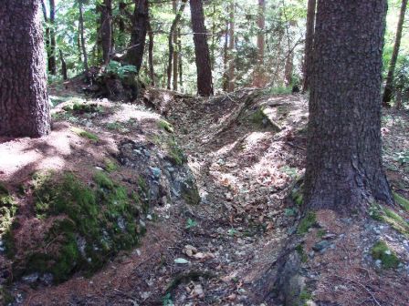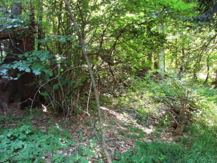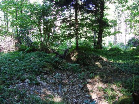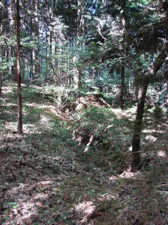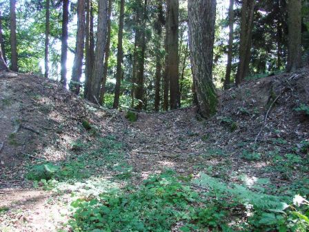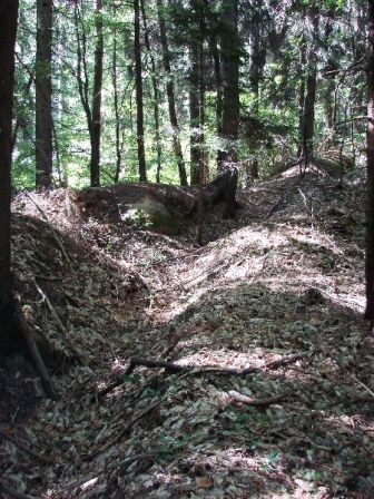 Die Scheinbatterie liegt nördlich der Kommandantenkasematte. Sie besteht aus einem Erdwall mit 4 Öffnungen. Hinter dem Wall verläuft ein Graben von Stellung zu Stellung, wahrscheinlich um die Rauchbomben anzuzünden. Dieser Graben entwickelt sich dann in Richtung Norden zu einer Verteidigungslinie. In dieser Linie waren einige kleine Stützpunkte mit jeweils rückwärtigem Zugang integriert und 2 große tiefe Stellungen. Wa da einmal drin stand entzieht sich meiner Kenntnis, sie gleichen denen von Minenwerfern, untereinander sind sie etwa 50 entfernt. VJ