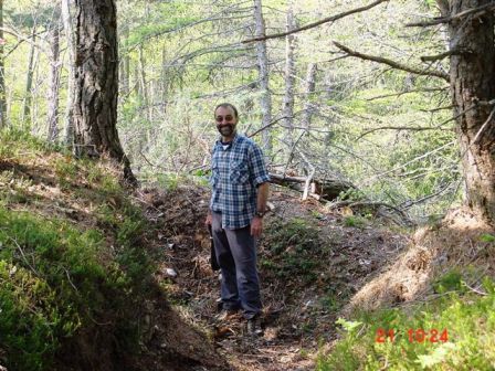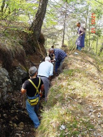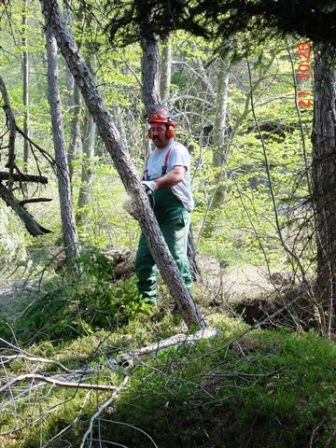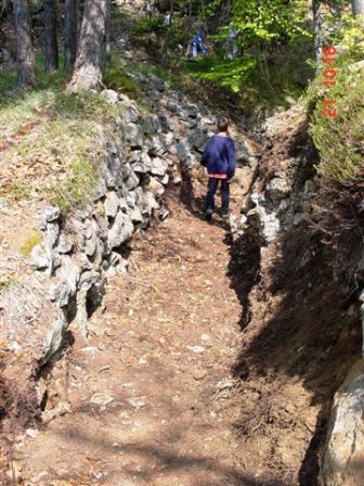 aiuta, un operaio taglia gli alberi vicino alla trincea. Arbeiten im Schützengraben, eine weitere Steintreppe gefunden, Dr. Condini hilft mit, ein Arbeiter fällt die Bäume nahe des Schützengrabens, die Wurzeln würden sonst den Graben zerstören....VJ