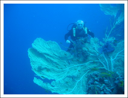Uli (ich) hinter einer großen Fächerkoralle, aufgenommen von Theo mit