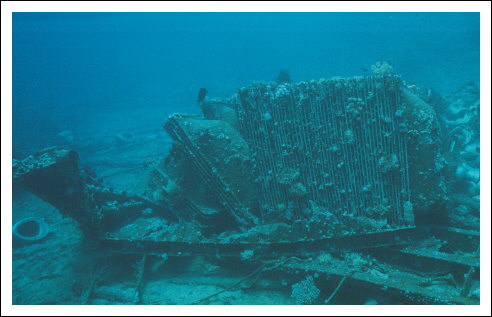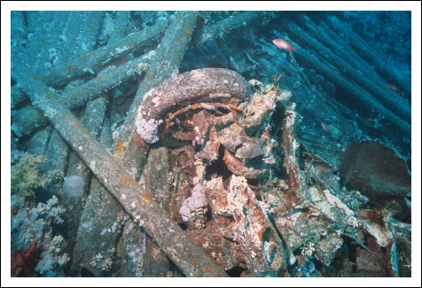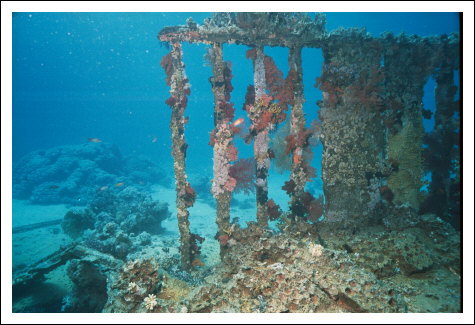 Der letzte noch stehende Container, mit Korallen bewachsen