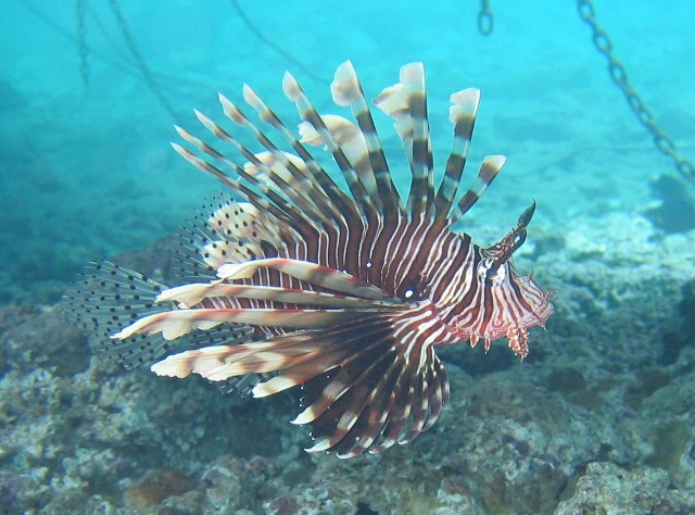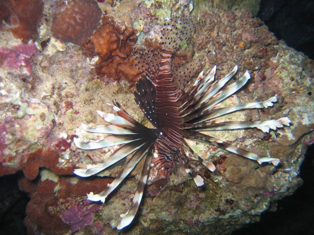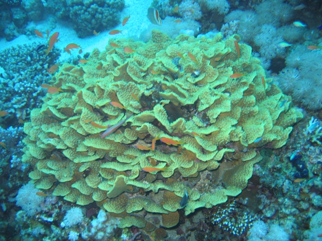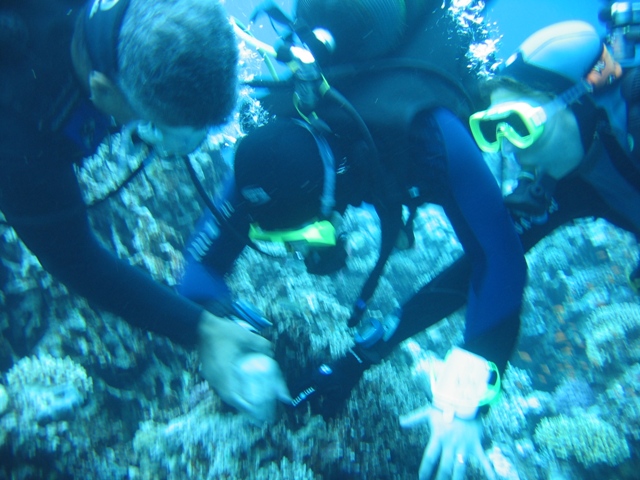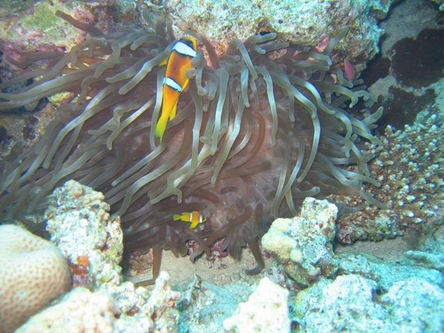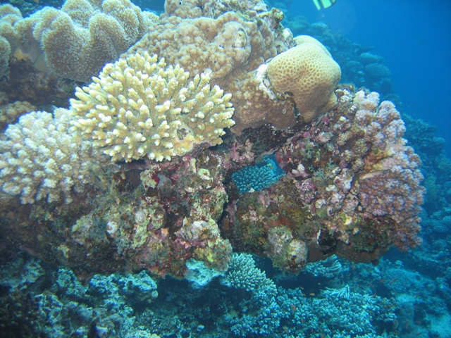 Hier über dem Blue Hole erlebten wir eine Situation im flachen Wasser, die schon fast ans lächerliche grenzte. Zwei Taucherinnen strampelten an einem Korallenblock um die Wette. Natürlich wollten wir sehen was da so interessantes zu sehen und zu bewundern gab, um solche körperlichen Anstrengungen zu rechtfertigen. Als wir uns um den Korallenblock versammelten, erkannten wir die Notlage. Eine Taucherin mit voll aufgeblasenem Jacket und zu wenig Blei hielt sich krampfhaft am Korallenblock fest um nicht in die Höhe zu schießen. Die Begleiterin, von Guide oder Tl möchte ich nicht sprechen, zu erkennen am orangenfarbigen IQ-Neoprenmaskenband, war völlig überfordert. So ließ unser Guide zuerst mal die Luft aus dem Jacket und wir fummelten unser, in dieser Notsituation, entbehrliches Blei aus den Taschen. Bei sechs Tauchern kommt dann doch einiges zusammen, was wir ihr in die Taschen stopfen konnten. Langsam merkte sie, dass sie keinen Auftrieb mehr hatte und ließ nur zögerlich, unser Guide löste einen Finger nach dem Anderen, den Korallenblock, ihren Lebensanker, los. Einen gehetzten Blick in die Runde werfend und schon waren die zwei Grazien mit unserem Blei verschwunden.