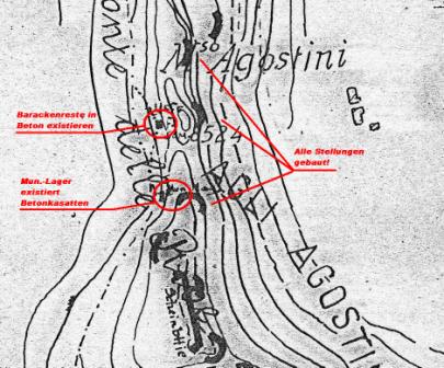 Alles laut Zeichnung vom Hauptmann Huetter. In einer Stellung der Batterie konstruierte man das neue Haus. Unglaublich! Die andere Stellung (Reste) ist vermutlich das Fundament des alten Stalles. Außerdem die große Unterkunftskaverne, ein Verbindungsgraben parallel zum Armierungsweg und die Munitionskaverne.