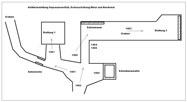 Diese ersten Stellungen befinden sich bereits oberhalb von Villa Paissan. Sie liegen auf dem südlichen Teil des Rückens vom Monte Soprasasso mit Schussrichtung West in Richtung Valle dei Laghi. Unterhalb dieser Stellungen liegt bereits das Werk Bus di Vela. Die aufgenommene Stellung ist nur ein Beispiel,