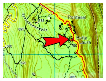65)Karte vom Soprasasso: Der Pfeil zeigt auf die Stelle der Baita Laura