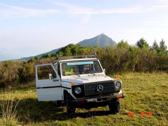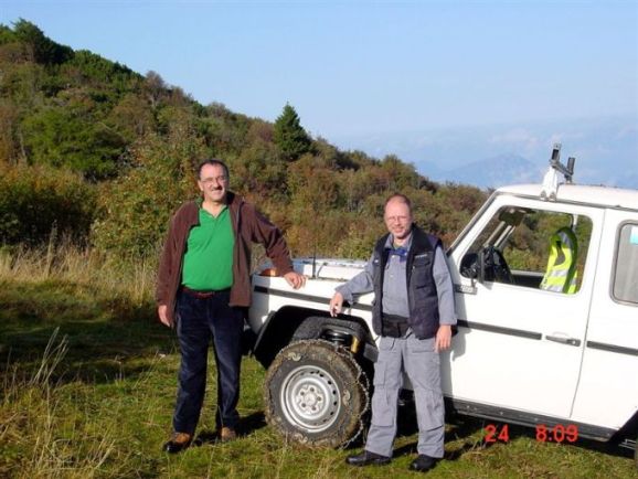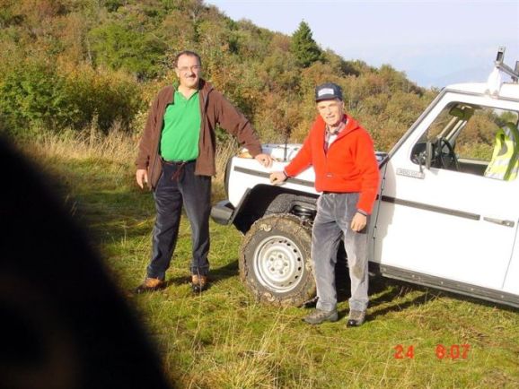 Der alte Mercedes braucht die Schneeketten, um über das extrem rutschiges Gelände hoch zu kommen. Der bullige 3 Liter Dieselmotor hat dann genug Drehmoment , um auch bei geringsten Drehzahlen den Wagen hoch zu bringen. Links im grünen Hemd ist Franco, rechts mit roter Jacke steht Lino. Wir haben gerade die Ketten montiert und machen eine kleine Pause. Wir dürfen dorthin fahren und haben eine Genehmigung der Forstverwaltung der Provinz Trient. Ansonsten sind diese Wege natürlich für jeden Verkehr gesperrt