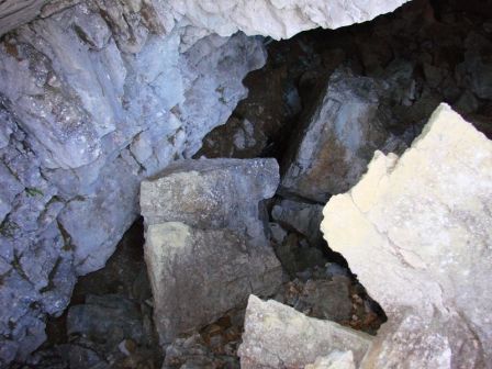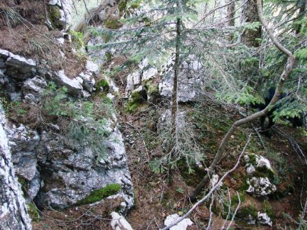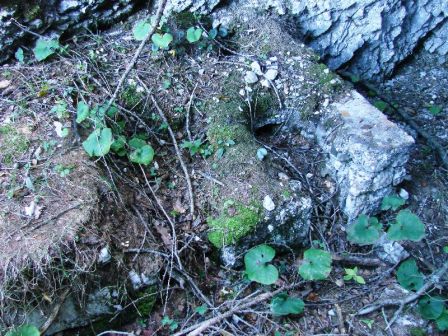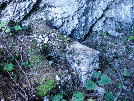 Questo minuscolo dosso e stato letteralmente perforato e non si tratta del dosso principale dello Spizom ovest. Numerose trincee e trincee di collegamento fra le caverne, resti di calcestruzzo e i fuochi della cucina.. Le caverne sono una sopra l´altra in linea diretto. Naturalmente a prova di bomba, l´ultima in alto (il comando) ha ancora una copertura di piu di 10m di roccia viva. Diese kleine Dosso wurde buchstäblich zerbohrt, es handelt sich noch nicht einmal um den Hauptgipfel des Spizom West. Viele Schützengräben und Verbindungsgräben zwischen den Kavernen , die in gerader Linie übereinander liegen, Reste von Beton und die Kochstellen,alles war natürlich bombensicher, die oberste Kaverne (das Kommando) hat noch 10m Felsüberdeckung