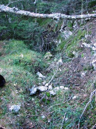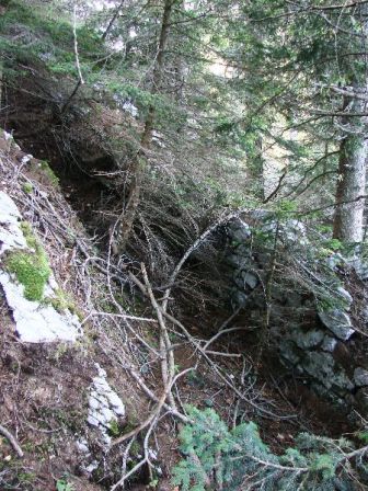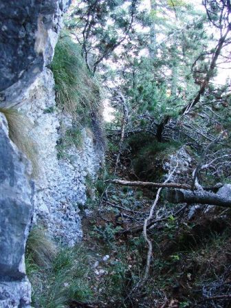 f der rückwärtigen Seite des kleinen Dosso, von dort führt ein verbindungsgraben aber auch auf den Spizom-Ost (noch nicht erkundet). Sulla parte dietro del minuscolo Dosso, da qui parte una trincea di collegamento anche sul Spizom-est. VJ