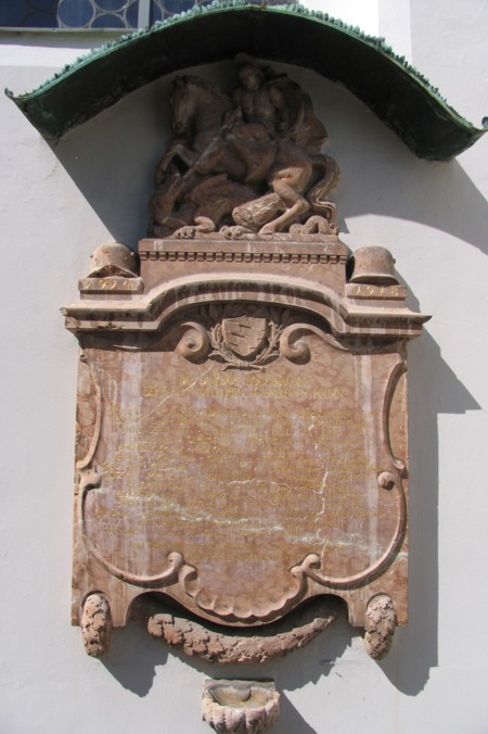 rote Steintafel an der Außenwand der Kirche St. Georg