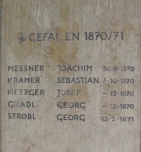 Denkmal vor der Kirche. Hinter dem Obelisken mit den Namen der Gefallenen der Kriege 1870 / 71 und 1914 / 18, die Tafeln mit den Namen der im WK 2 Gefallenen und Vermißten. Inschrift Obelisk: