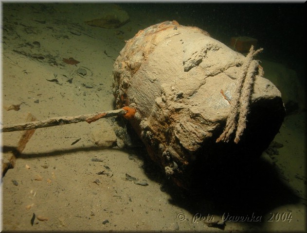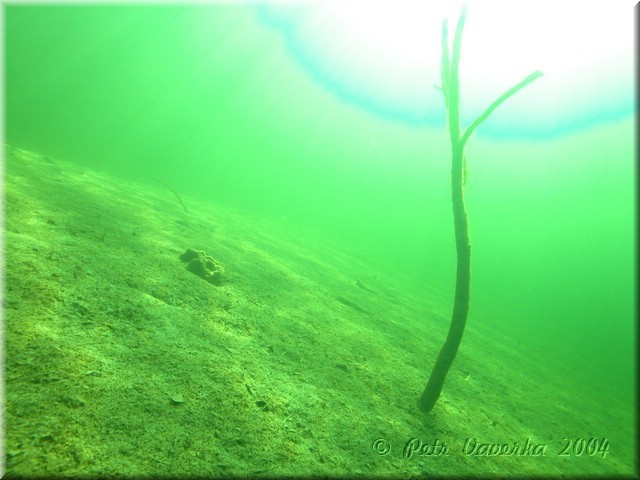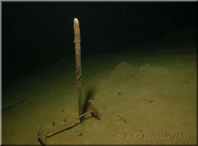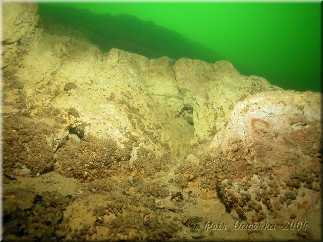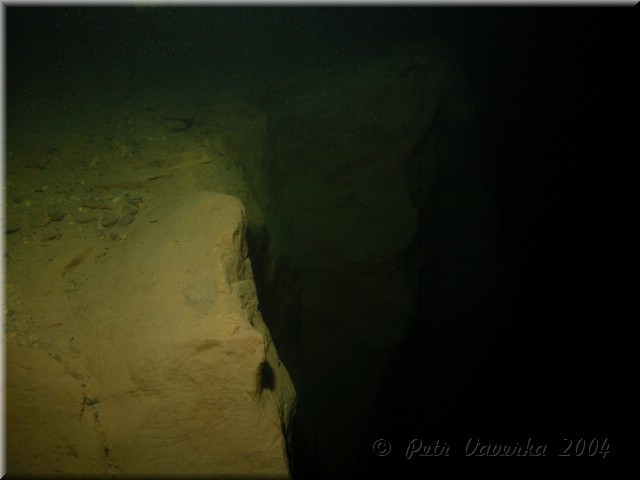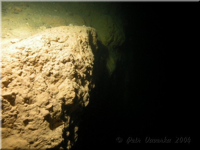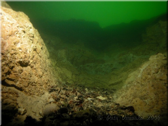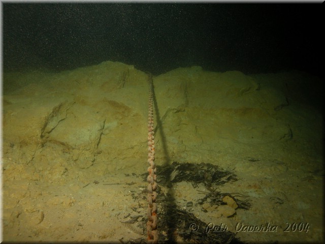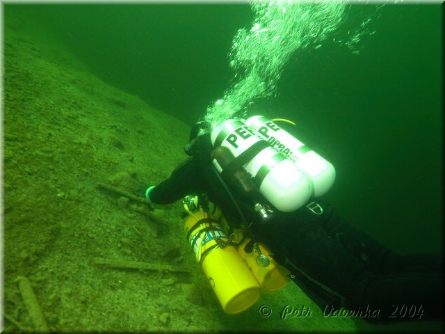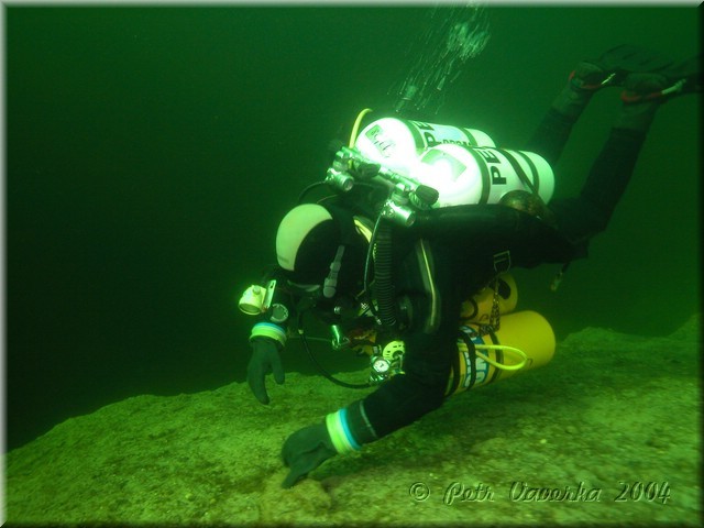 zu erreichen sind. Original Petr: Unsere Tauchgänge am Wasserwacht gehören zu den Tauchgängen, die wir nicht extra vorbereiten. Ich war ungefähr 10mal in der Steilwand und jetzt bin ich dort relativ gut orientiert. Die Sicht ist in Partien unter 40m immer über 10m weit und tiefer noch besser und klarer. Fotografieren größerer Objekte, in absoluter Dunkelheit ist aber immer durch Schwebeteile kompliziert und mühsam. Für eine Tiefe von 65m benutzen wir Trimix 18/45.Wenn wir mit einer 20min.bottom time rechnen, ist ein 2x15 Liter Set sehr knapp bemessen (mit Notstandvorrat). Für Dekompression nehmen wir ab 21m EAN 50 in 11 Liter Stage-Flaschen und ab 6m atmen wir reinen Sauerstoff. Für unseren Trockenanzug nehmen wir Argon zur Isolation um die Kälte besser ertragen zu können. Die Zeiten für unseren letzten Tauchgang am