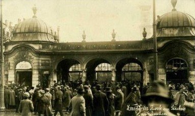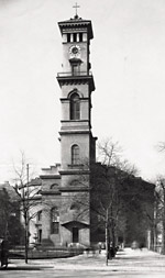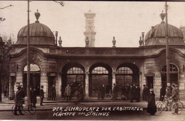 Im Hintergrund ist die evangelische Mathäus-Kirche zu sehen, die es an diesem Standort auch nicht mehr gibt. Die Trambahngleise gingen Heute längs durch das Kirchenschiff.