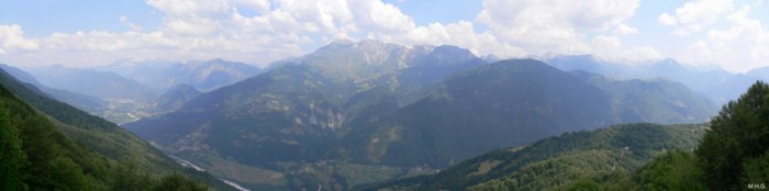Das Panoramabild wurde am Rand des Kolovrat in Höhe Trinski vrh 1139 aufgenommen und zeigt das gesamte Kampfgebiet von Tolmein (ganz rechts hinter dem Hügel) über Karfreit (links Mitte) und Flitsch/Bovece ( auf dem Bild oberhalb Karfreit hinter dem Stolrücken.) Durch den kühnen Plan und deren Umsetzung das Tal von Tolmein und Bovece aus zu öffnen wurde die KRN Front abgeschnitten ( KRN ist der überragende Berg in der Mitte den Italiener hielten) Am 24.10. 1917 Morgens hatte der Italiener allerdings nicht so eine gute Sicht. Auszug aus Die 12. Isonzoschlacht http://gebirgskrieg.heim.at „Inzwischen dringt die deutsche Division Lequis aus der Talstraße von Tolmein ungestüm vorwärts. Rechts und links hält zwar der Feind beherrschende Höhenstellungen. Aber Nebelschwaden hindern die Fernsicht und den Blick in das Tal. Der Italiener ahnt nicht, dass tief unten deutsche Infanterie durchstößt auf Karfreit, dass bereits 1 Uhr nachmittags Kamno, bald nach 2 Uhr Idersko am Isonzo erreicht ist. Die Grundlinie des ganzen Bergsystems vom Krn zum Kolovrat wird eingerissen durch den kühnen Talmarsch der Division Lequis“