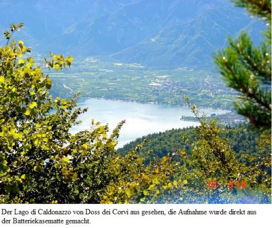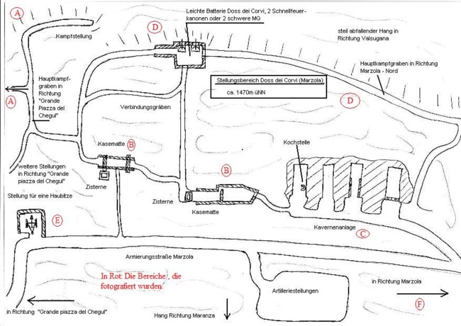 soll heißen: Der Stützpunkt Doss dei Corvi besteht aus der leichten Batterie auf dem Gipfel (Betonkasematte für 2 Schnellfeuerkanonen oder 2 schweren MG), einem umfangreichen und zum größten Teil ausgemauerten Hauptkampfgraben, Verbindungsgräben, Kavernenanlagen und Artilleriestellungen. Auf der Feindseite fällt der Berg steil ab, fast senkrecht. Die gewählte Position war strategisch hervorragend gewählt. Der Schussbereich seiner Geschütze und Haubitzen war das Valsugana. Von seinen Stellungen aus konnte der gesamte Bereich vollständig eingesehen werden, es besteht Sichtkontakt zu Panzerhaubitzbatterie Busa Grande, zum Panarotta, zu Cima Vezzena, ja sogar die Hochfläche der 7 Gemeinden konnte eingesehen werden. Die Stellungen sind heute noch gut sichtbar und begehbar. Selbst die Kochstelle in einer Kaverne ist erhalten. Nachfolgend die Dokumentation. Sie beginnt mit Stellungsbereichen von der „Grande piazza del Chegul“ und führt direkt durch den Hauptkampfgraben zum Stützpunkt Doss dei Corvi. Von da aus geht der Hauptkampfgraben weiter in den nächsten Stützpunkt Marzola-Nord. VJ Armierungstraßen und Stützpunkte Maranza und nördlicher Teil des Marzola