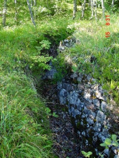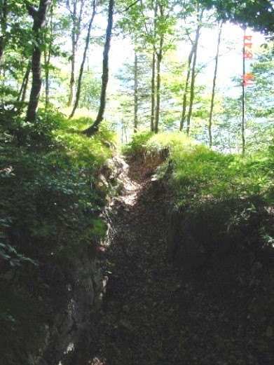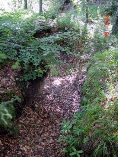 Die Bilder zeigen Bereiche des gemauerten Hauptkampfgrabens im Stützpunkt Doss dei Corvi.Mehrere Verbindungsgräben führen in rückwärtige Bereiche. Dort befinden sich 2 große teilweise in den Fels gehauene und ausbetonierte Kasematten, die ein Betondach hatten. Auch 2 intakte Zisternen gibt es noch, eine ist zum Teil noch mit einer alten Wasserleitung verbunden.