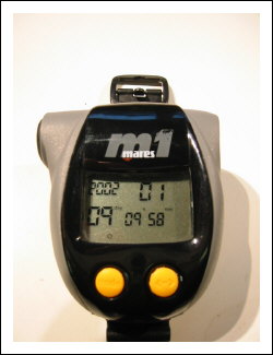| Mares m1 Tauchcomputer   Der nitroxfähige M1 fällt durch seine eigenwillige Form auf, was wohl teilweise auf die aaa micro Batterien zurückzuführen ist. Er besitzt ein mehr als ausreichend langes Armband welches mit Sicherheit um jedes Handgelenk inklusive Trocki passt. Leider hat er ein ziemlich kleines Display im Gegensatz zu seinen Abmessungen. Die Datenanzeige ist für einen schnellen Überblick etwas zu klein. Besonders die älteren Taucher haben diesen Punkt bemängelt. Sehr gut und wichtig ist die schnell reagierende Temperaturanzeige. Die Beleuchtung ist ausreichend um bei Dunkelheit oder schlechten Lichtverhältnissen die Daten zu erkennen. Die Bedienung des M1 erfolgt durch die zwei gelben Knöpfe „Mode“ und „ <->“ diese sind aber nichts für zarte Hände, da sich die Knöpfe nur durch festes Drücken bedienen lassen.. Die Menüführung ist am Anfang gewöhnungsbedürftig, da man durch das abwechselnde lange und kurze Drücken nicht immer gleich zu dem richtigen Ergebnis kommt. Warum aber im Hauptmenü mit der linken Taste nach rechts und mit der rechten nach links gescrollt wird bleibt ein Rätsel. Das Logbook ist sehr ausführlich, Datum, Uhrzeit, Luft oder Nitrox, Tiefe, Zeit und Temperatur. Selbstverständlich ist es möglich ihn mit dem PC auszulesen. Der M1 ist ein vollwertiger Deko Rechner der ebenso für normale Atemluft geeignet ist wie für Sauerstoff angereicherte Luft (Nitrox) bis zu 50 %. Bei Nichteinhalten der Dekophase oder bei zu hohem Dekostop macht der M1 lautstark auf sich aufmerksam. Den Aufstieg zeigt er durch eine kleine Skala an, welche bei zu schnellem Aufstieg mit einem nicht allzu aufdringlichem Warnton verbunden ist. Das Preis-Leistungsverhältnis ist gut. Ein großer Vorteil ist die Möglichkeit die Batterien in der Größe aaa selbst zu wechseln.