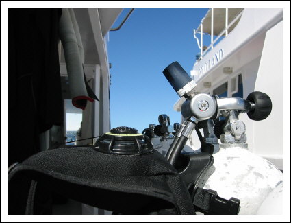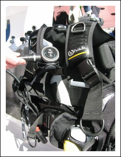 Die Rückenschale, hinter der sich die Verbindungsschläuche und Kupplungen befinden, ist sehr angenehm. Das neuartige De-Inflatesystem befindet sich an der unteren linken Seite des Jackets und ist mit einem oberen und einem untern Auslassventil verbunden. Es ist auch noch oben rechts ein manuell benutzbares Auslassventil vorhanden. Nach kurzer Gewöhnungszeit ist diese Art des Tarierens sehr angenehm und geht leicht von der Hand. Es verfügt über zwei kleine D-Ringe, zum Befestigen von Gegenständen, sowie zwei Taschen wovon eine schon mit dem Mares Proton gefüllt ist. Falls die Luft einmal knapp wird, lässt sich das Jacket über einen Schlauch mit Luft befüllen. Die integrierten Bleitaschen sind gut seitlich positioniert und mit dem neuen System befestigt. Die Bleitaschen lassen sich leicht entfernen, sollten aber vor dem Anlegen des Jackets eingepasst werden. Sie fassen maximal 3 Kilo Blei pro Seite. Leider sehen die Hartplastikteile schon nach kurzem Gebrauch recht verkratzt aus. Der Mares Proton ist fest am Jacket installiert. Von der 1 Stufe gehen zwei senkrecht verlaufende Schläuche zu einer Mehrfachkupplung und zum Inflator. Aus der rechten Tasche kommt die zweite Stufe, der Proton mit einem ausreichend langem Schlauch, der nicht vom Körper wegsteht heraus. Der Proton unseres Hup blies des öfteren unkontrolliert beim Reinspringen vom Tauchboot, während er sich im Mund befand ab und nicht mehr zu stoppen. Wir mussten das Flaschenventil zudrehen um die Situation zu retten. So ergab es sich, dass mit dem Tester zeitgleich und nahe an der Flasche ein zweiter Taucher reinsprang um sofort zu helfen.