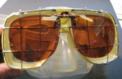 Noch einen sehr großen Vorteil hätte das Gitter, man kann einen handelsüblichen Vorhänger für Brillenfassungen ( ca. 18.- Euro ) mit Rotfilterwirkung einklemmen. Durch das Scharnierteil, das serienmäßig vorhanden ist, ist der nach Bedarf hochklappbar.
