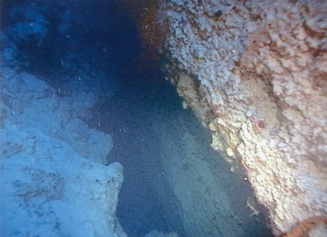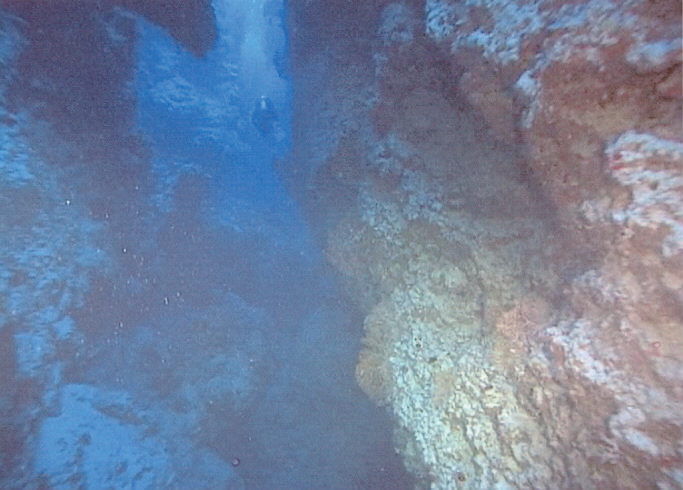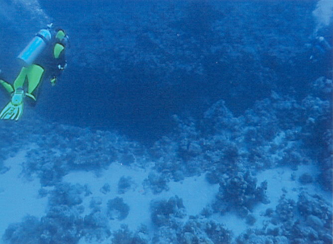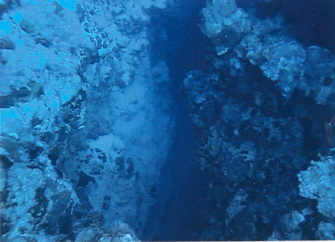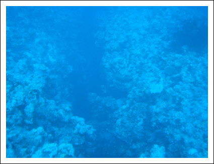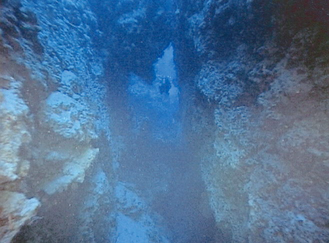 Seite vom Thomas Riff. Der Tauchgang beginnt beim Ankersymbol an der südöstlichen Seite. Das Tauchboot fährt rückwärts an das Riff und der zügige Ausstieg beginnt. Nach kurzem Sammeln trägt einen die Strömung nach Norden. So kommt man an der Sandfläche auf 25 Metern vorbei und es erscheint der Canyon. Er beginnt plötzlich. Ein Spalt tut sich auf mit 2 Metern Breite und 5 Metern Tiefe, in dem man senkrecht einschweben kann, wie auf dem ersten Foto auf der rechten Seite zu sehen ist. Hier herrscht schon Dämmerlicht und eine Lampe dient nicht nur zur Orientierung, sondern zeigt auch den Buddy´s die Standorte an. Die Augen gewöhnen sich erstaunlich schnell ans Dämmerlicht das nur verschiedene Blautöne zulässt. Das zweite Bild zeigt den engen Einstieg und den weiteren Verlauf des Canyon. Im Bild drei ist der erste Taucher bereits durch den ersten Bogen mit dem runterhängenden Zapfen durchgetaucht. Im Bild vier sieht man schon die zweite Canyonbrücke unter der man auch problemlos durchtauchen kann. Hier öffnet sich, Bild fünf, der Canyon in bodenlose Tiefe und Dunkelheit. Hier ist es problemlos möglich den nach oben weiterwerdenden Canyon, wie auch an anderen Stellen, zu verlassen. Wie es aus dem helleren, türkisscheinenden, Wasser auf dem Foto sechs zu sehen ist. Der Taucher im Bild lässt sich etwas sinken, um durch den dritten Bogen zu tauchen. Hier sind keine Farben mehr, außer Blau und leichte Grüntöne zu erkennen. Foto sieben, beim Durchtauchen des dritten Bogens. Nach dem dritten Bogen beginnt für uns nach 5 Minuten Tauchzeit der Aufstieg, wir sind immer noch in der Nullzeit. Der Canyon geht weiter in die unendlichen Tiefen des roten Meeres, das sich in der Dunkelheit verliert. Die Taucher erreichen die Canyon-Kante, die im heller werdenden Wasser deutlich zu sehen ist. Mit Licht erscheinen selbst im dunklen Canyon die Gewächse in den gewohnt bunten Farben. Wir tauchen weiter auf und lassen uns von der Drift um das Riff mitnehmen. Auf der nördlichen Riffseite wird es durch die fehlende Sonneneinstrahlung dunkler. Erst auf der westlichen Seite dringt wieder Sonnenlicht durch das Wasser. Mit viel Glück lassen sich auf der Westseite Weißspitzenriffhaie sehen. So tauchen wir nach 40 Minuten beim Strömungswirbel an der südwestlichen Seite nach 40 Minuten auf. Er ist von unten durch kleine kurze Wellen gut sichtbar und durch die fehlende weiterführende Strömung fühlbar. An der Oberfläche wartet schon das Tauchboot auf uns. So flosselten wir an der Oberfläche vom Riff weg auf das Boot zu, das eine Leine auswarf um uns einzuholen.