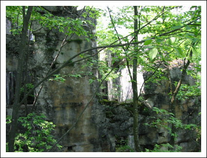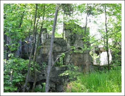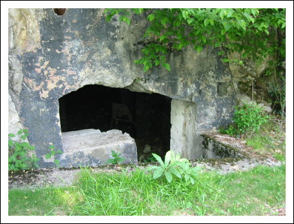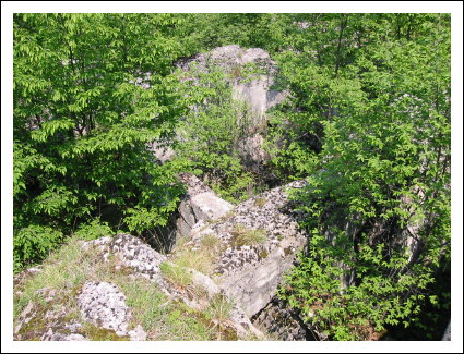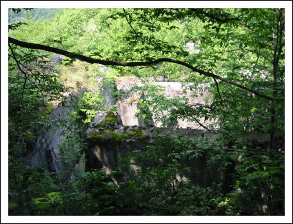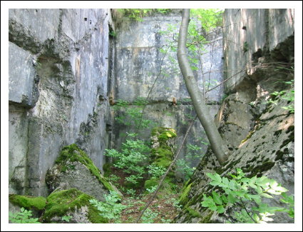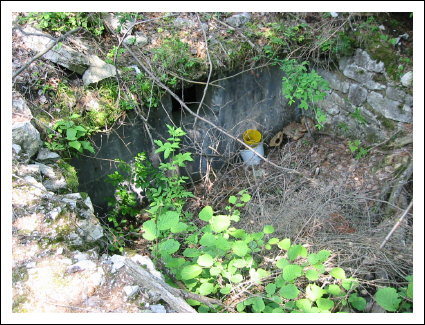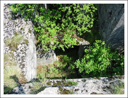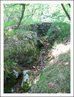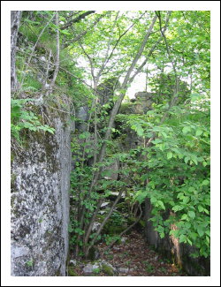 Auf der rechten Seite ist ein kleines Wachhäusel. Hier verlassen wir die Straße und biegen nach links zu einer sichtbaren Ruine. Hier handelt es sich um das Werk Piccolo Tombio. Rechts herum geht ein kleiner Pfad und führt zu den eigentlichen Überresten der Werks. Es schaut richtig verwunschen aus. Die Ruinen sind mit Moos bewachsen und viele Baume stehen in den Räumen und geben gespenstigen Halbschatten in die unübersichtlichen Aufteilung. Den Zusammenhang sieht man dann von oben besser. Achtung, die Grasnarben gehen bis zu den Mauerkanten und sind rutschig.