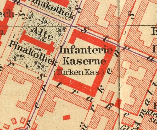 Der große dreiflügelige Bau zwischen Gabelsbergerstr., Türkenstr., Barerstr. und Theresienstr. wurde nach dem Zweiten Weltkrieg bis auf die Eingangshalle abgetragen.