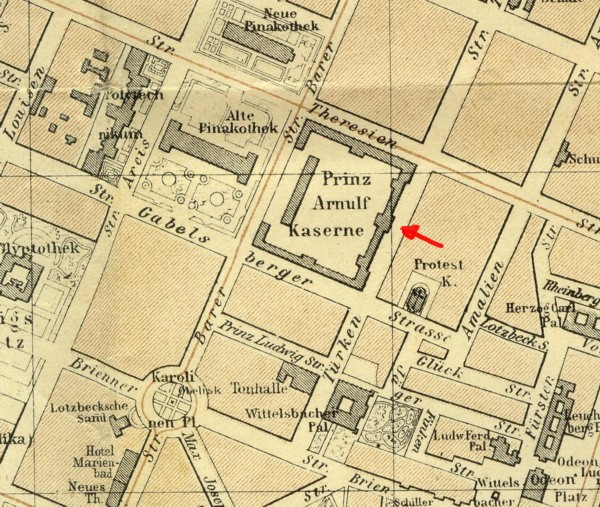 Früher war es das Eingangstor der Infanteriekaserne des bayerischen Leibregiments, das auch in den Alpen an der Seite Österreichs kämpfte (kurz Leiber genannt). Im Volksmund wurde die Kaserne Türkenkaserne genannt, weil hier nach den Türkenkriegen osmanische Kriegsgefangene einen Kanal für Gondelfahrten der bayerischen Kurfürsten ausheben mussten. Später wurde sie in Prinz Arnulf Kaserne umbenannt der sich aber nicht durchsetzen konnte. Im 2. WK wurde die Kaserne durch Luftangriffe schwer beschädigt und erst 1960 bis auf das Tor abgerissen. Das Areal der Kaserne ist bis heute im Plan der Maxvorstadt deutlich im Stadtplan als gleichmäßiges Viereck zwischen Türkenstraße, Barer Straße, Gabelsberger und Theresienstraße zu erkennen.