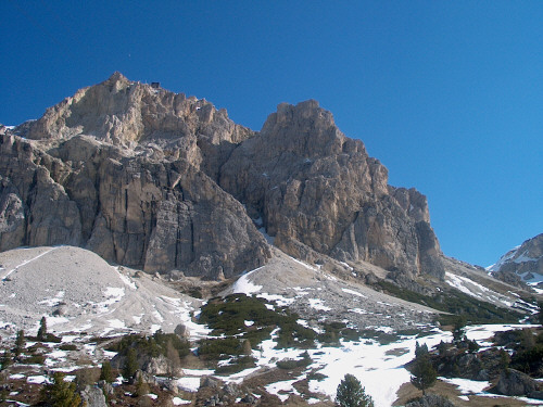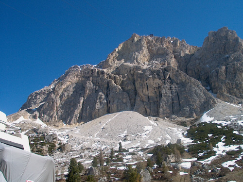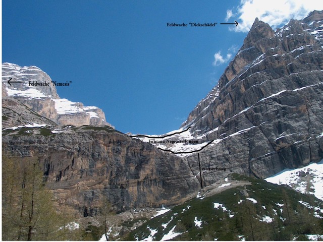 Das Travenanzestal, eines der wohl schönsten Bergtäler der Dolomiten, trennt die Tofanagruppe von den Fanesbergen. Vom Falzaregopass zwischen der kl. Lagazuoi und der Tofana I zieht das Tal in Bogenform bis zum Monte Vallon Bianco hin. Anfahrt gleich wie zum Werk Tra i Sassi am Valparolapass, von hier weiter bis zur Seilbahn am Falzaregopass. (ca. 3km) Von hier aus geht´s zu Fuß weiter, Bergausrüstung und gutes Schuhwerk sind jedoch notwendig! Vom Parkplatz aus auf Weg nr. 402 zur Forcella Travenanzes, oder von der Bergstation der Seilbahn von kl. Lagazuoi absteigend zur Forcella.( weg 401) Als Landkarte ist Kompass Nr. 55 Cortina d´Ampezzo 1:50000 zu empfehlen. Von der Forcella aus kann man das Tal gut übersehen. Es ist möglich über die Fontana Negra Scharte die Tofana I zu umrunden, jedoch ist Bergerfahrung erforderlich da es sich teilweise um eine so genannte Via Ferrata (Klettersteig) handelt. Die Kämpfe um das Travenanzestal: Im Frühjahr des Jahres 1915 besetzten das Deutsche Alpenkorps die Tofana I, die Fontana Nerga Scharte, auf Tofana II und III hatten sich die Alpini verschanzt. Um durch das Tal durchbrechen zu können musste als erstes die Fontana Nerga-Stellung genommen werden, die jedoch von den bayrischen Leibregiment (Leiber) hartnäckig verteidigt wurde. Neben der Schartenstellung entstanden die Feldwache "Nemensis" in den Wänden der Tofana III und "Dickschädel" in der Wand der Tofana I welche von großem Nutzen waren als die Tofana I den Alpini überlassen werden musste, die Versorgung des Gipfels musste über die Felswände erfolgen während die Alpini von Ihrer Seite einen guten Zugang besaßen. Auch die Fontana Nergra konnte von Österreichischer Seite nur über 270 in die Felswand geschlagenen Eisensprossen unter Feindeinsicht erreicht werden. Über diesen Zugang konnte im Angriffsfall kaum Mannschaften und Material nachgeschoben werden, was Ende 1915 dann zur Eroberung durch die Alpini führte. Im Sommer 1915 wurde hier aber verbissen gekämpft, hier fiel auch der einzige General des Krieges, Antonio Cantore leitete selbst einen Italienischen Angriff in vorderster Front, zur Tarnung trug er einen einfachen Soldatenrock vergaß aber seine Generalskappe abzunehmen. Ein Scharfschütze erkannte die Kappe im Zielfernrohr und tötete den General mit einem Kopfschuss. Ausführliche Berichte findet man im Buch von Gunther Langes "Die Front im Fels und Eis" Athesiaverlag Bozen. Nach dem Verlust der Fontana Nerga Stellung mit den Feldwachen Nemensis und Dickschädel war nur mehr die Felsnadel Punta di Bois von den Ostereichern besetzt, diese jedoch störte die Italiener gewaltig, hatten die Kaiserjäger eine schöne Sicht auf die Dolomitenstrasse auf der der Ital. Nachschub rollte. Natürlich schauten die Kaiserjäger nicht nur runter sondern schossen mit einem Wassergekühlten Schwarzlose MG und einem kl. Geschütz auf alles was sich blicken lies. Nur nachts oder bei Nebel konnte der Nachschub rollen, der Nebel ist in den Bergen jedoch ein schlechter Verbündeter, einmal lichtete sich der Nebel schlagartig und vor der Mg Mannschaft rüstete sich eine Alpinieinheit zum Angriff auf die Punta di Bois! Das MG feuerte sofort und hörte nicht mehr auf bis der Letzte Angreifer gefallen war, Hunderte von jungen Alpinisoldaten machte ein einziges MG den Gar aus. Da die Punta mit üblichen Mitteln nicht zu erobern war, wurde der Felszahn gesprengt, was zum Erfolg für die Alpini führte. Die Front verlagerte sich dann in den Sattel zwischen Lagazuoi und Tofana I , hier wurden die größeren Felsbrocken die rumlagen, zu Minibunker ausgebaut, so dass die Front endgültig zum Stellungskrieg wurde.