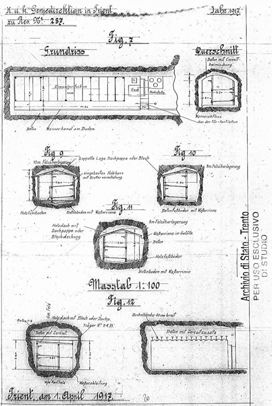 Die FS Trient war schon lange entwaffnet, aber die Erfahrungen im Kavernenbau des Genies von Trient dokumentiert diese Zeichnung. Ab 6m Felsüberdeckung oder weniger wurde eine mit Stahlträgern und Blechen verstärkende Betondecke zusätzlich eingezogen, der Innenausbau der Kavernen wurde vereinfacht, billiger gemacht, quasi industrialisiert, wie man heute sagen würde. Die Lösungen waren auch schnell durchführbar und verbrauchten wesentlich geringere Mengen an Material. Sicher gegen Beschuss waren diese Kavernen aber perfekt!-Gruss VJ