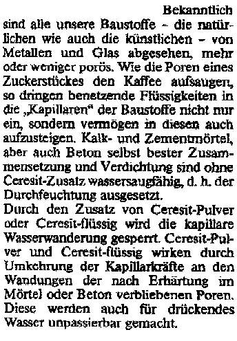 gleiche. Ceresit, oder wie damals auch geschrieben Zeresit , war der „Wunderstoff“, der die Kavernen trocken ließ, selbst gegen drückendes Wasser erfüllte er seinen Zweck. Der Zusatzstoff konnte sparsam verwendet werden :