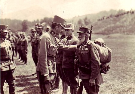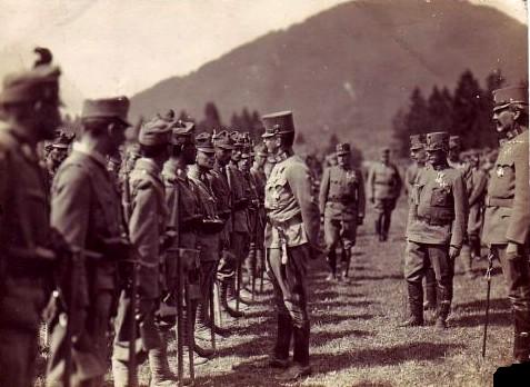 Kaiser Karl während einer Truppenparade 1918, man beachte den alten Trentiner Schützen,vermutlich Pergine-Valsugana. Fotos: eigener Besitz. Imperatore Carlo durante una parata delle truppe austro-ungariche 1918, probabilmente a Pergine Valsugana. Si nota il vecchio volontario trentino, un Kaiserschütze.Fotos del mio archivio. Saluti,VJ