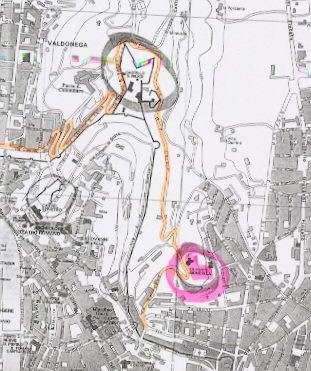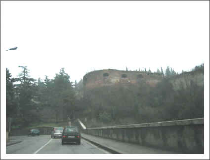 Bei der Bergauffahrt geht es an der wuchtigen Stadtmauer entlang.