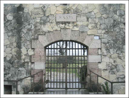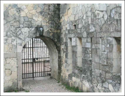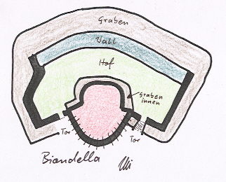 Hier der rechte Eingang über dem Graben eine Brücke.