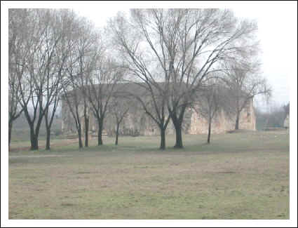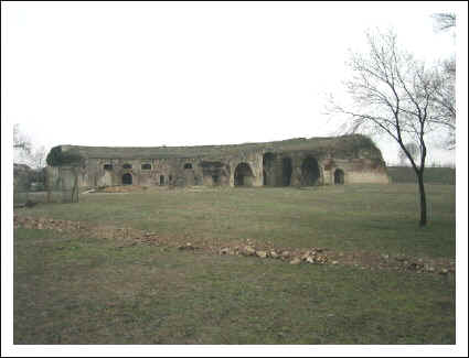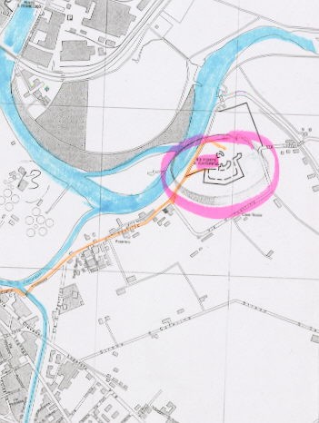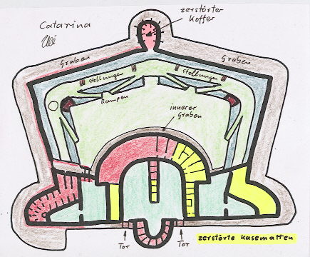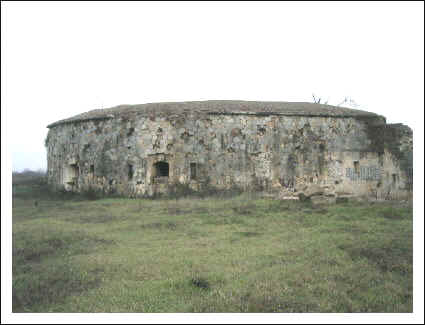 Das Werk liegt etwas außerhalb, direkt an einem Militärgelände. Die Via d. Pestrino macht eine scharfe Rechtskurve um das Militärgelände. Hier fährt man geradeaus unter einer offenen Schranke durch bis an das Tor oder wenn es offen ist auf den Parkplatz. Bei mir war das Tor geschlossen und so ging ich den Weg etwas weiter und als ich durch die Büsche sah, dass sich der Zaun abzweigt, bin ich die Böschung rauf, über einen Stacheldraht drüber, am Zaun entlang. So konnte ich den Kehlkoffer mit den zwei Eingangsbereichen von außen sehen. Die man sonst nicht zu Gesicht bekommt. Durch eine sehr große Öffnung im Zaun machte ich mich bei einem abgestellten Wohnwagen aufmerksam. So wurde ich freundlich begrüßt, war er doch erstaunt, dass sich bei diesen Regenwetter jemand in das Fort verirrt. Daher hatte er das Tor nicht geöffnet, da auch der Parkplatz im Morast versank.