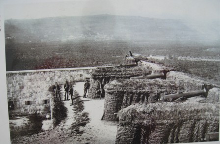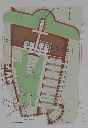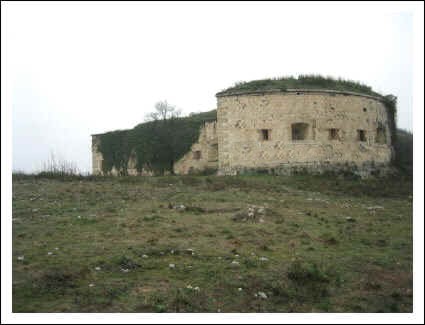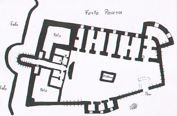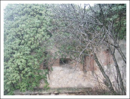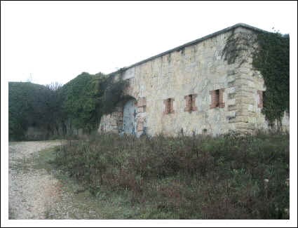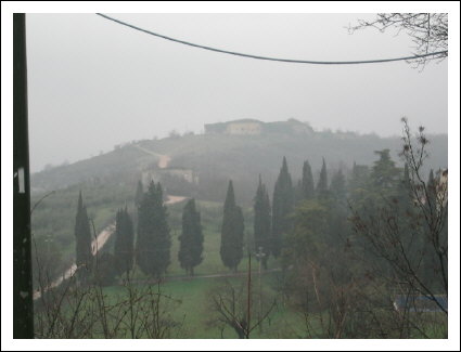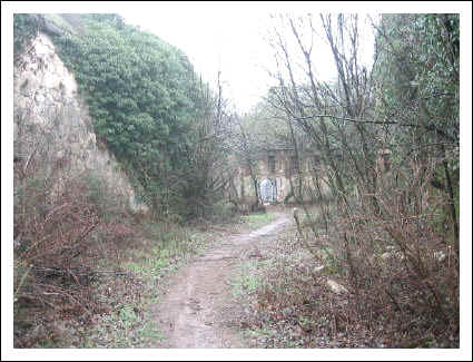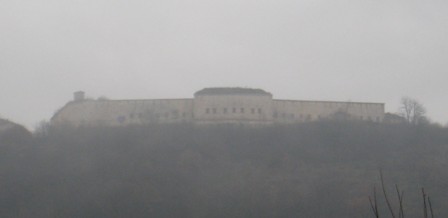 Selbst bei unserem trüben Wetter war der Hügel auf der linken Seite, nach Osten fahrend, gut zu sehen. Die Burg ist ausgeschildert. Die Teerstraße geht dann nach einiger Zeit in eine Schotterstraße über. Rechts zweigt ein Weg zur Burg ab, wir fahren aber weiter, bis zu einem größeren Platz um das Auto zu parken. Hier geht der Fußweg (8 Min.) zum Werk ab.