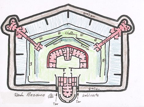 So sieht man den Kehlkoffer, gebaut wie alle anderen Forts, durch das