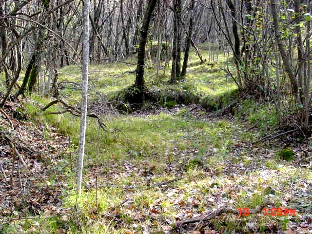 Ich fand sofort auf weitere Stellungen. Der typische planierte Boden mit dem vorliegenden Schutzwall ließ auf eine Haubitzstellung schließen. Links der Wall in Richtung Süden, davor die Stellung. Volker Jeschkeit