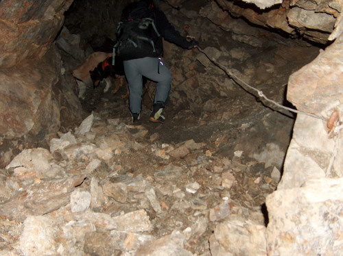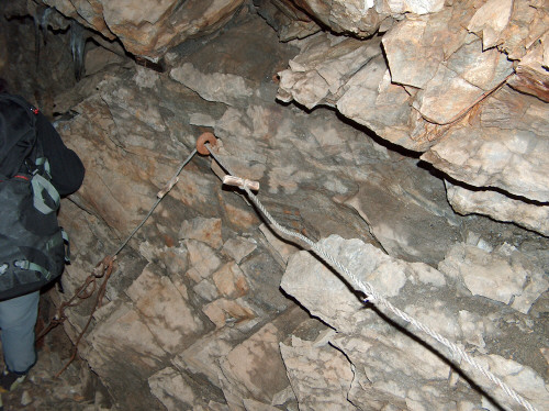 Gang steigt an, ein altes Drahtseil als Steighilfe