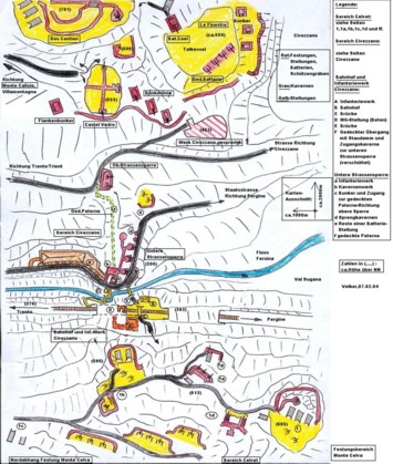 Blockierung des Val Sugana Taleinganges Richtung Trient Die hier beigefügte Skizze zeigt in etwa einen geografischen Ausschnitt von ca. 2000 m in Nord-Süd Richtung und ca.1000 m in Ost-West Richtung. Westlich liegt die Stadt Trient, ca 4 Km entfernt, östlich weitet sich das Val Sugana Tal unmittelbar nach dem Bahnhof Civezzano auf, in eine weite Talebene übergehend. Oberhalb des Bereiches Dos Castion beginnt bereits der Verteidigungsbereich der feldmässigen Befestigung Monte Calisio mit seinen Stellungen, Kavernenanlagen und Batterien am Osthang. Unterhalb