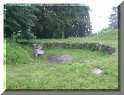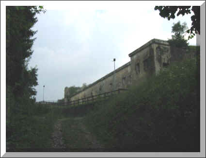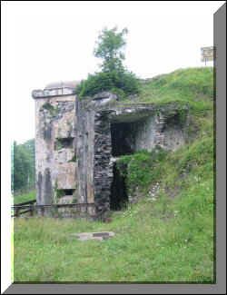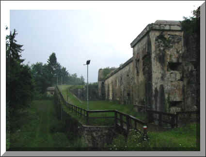 An der Straße 237 von Anfo nach Vestone führt links die erste und einzige Straße über die Brücke nach Osten. Es ist natürlich kein Wegweiser vorhanden, weder zur nächsten Ortschaft noch zum Ex Forte. Eine schmale Teerstraße schlängelt sich bergauf und oben am Pass ist, oh Wunder, ein Wegweiser nach Valledrane. Kein Hinweis zum Fort. Die Straße geht am Sanatorium vorbei zu einem großen Parkplatz. Nach 5 Minuten sieht man das beieindruckende Ex Forte Valledrane. Leider hatten wir starken Regen.