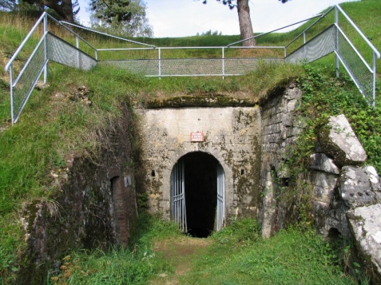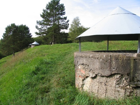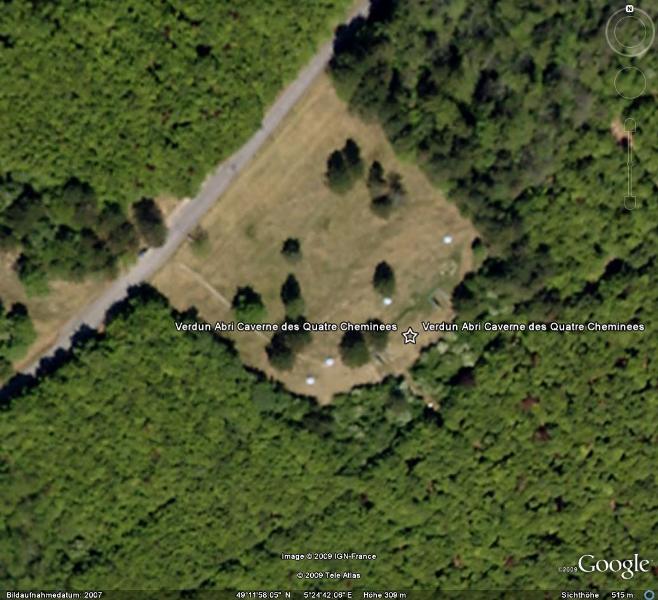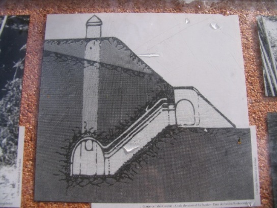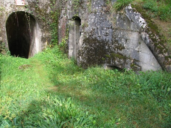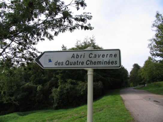 Text an der Besucherinfo: Der unterirdische Schutzbunker Quatre Cheminees liegt auf der Anhöhe Froideterre, in der Hangseite einer tiefen Schlucht. Im Laufe der Kampfhandlungen kam er für 10 Monate ins Zentrum des von Franzosen und Deutschen umkämpften Bollwerk-Vierecks zu liegen. Er war eine wichtige Etappe für die Ablösungseinheiten auf dem Weg durch den Weinberghang „Ravin des Vignes“ zum Hochplateau Thiaumont oder zum Hügelzug Fleury. Er war 1890 zur Unterbringung von