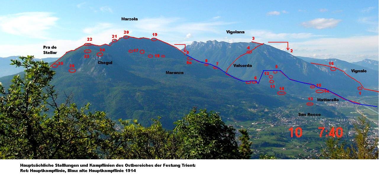 Hier kann man sich in etwa vorstellen, wie diese Verteidigung aussah. Die Kreise sind die wichtigsten und größten Stützpunkte. Erläuterungen: 1) Kavernenbatterie Murazzi 2) Stützpunkt Spizom West und Ost, hinter dem Rücken des Vigolana 3) Kampflinie auf dem Vigolana (Malga Derocca) 4) Kavernenbatterie Col di Caura 5) Dos Fornas 6) Befestigungen im Bereich der alten Batterie Brusa Fer 7) Batterie Maranza und umliegende neue Befestigungen 8) Blockhaus Maranza und neue feldmässige Befestigungen 9) Kavernenbatterie Vigolo Vattaro (hinter dem Marzola Rücken) 9a) Bivak Maranza, Haubitzenstellungen 10) Artilleriestellungen Bereich Valsorda-Pianizza 11) Kavernenbatterie Dos Fornas 1 12) Kavernenbatterie Dos Fornas 2 13) Werk san Rocco 14) Bereich Mattarello 15) PzH-Batterie Zampetta 16) Stützpunkt Vignale-Gruppe Ondertoller 17) Haubitzenstellungen Maranza 18) weitere Haubitzenstellungen 19) Artillerie Marzola Süd 20) Artillerie Marzola Nord 21) Artillerie Marzola Nord II 22) Artillerie Doss dei Corvi 23) Artillerie Chegul Nord 24) Artillerie Chegul-grande piazza 25) Artillerie Pra de Stellar 26) Artillerie Pra de Stellar II Die rote neue Kampflinie steigt in das Valsorda ab und geht über den Ort Vigolo Vattaro hoch auf den Rücken des Marzola, passiert dabei vor der Kavernenbatterie Vigolo Vattaro