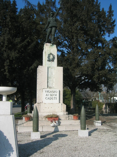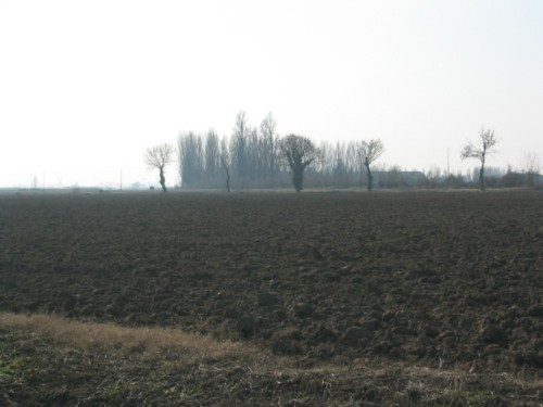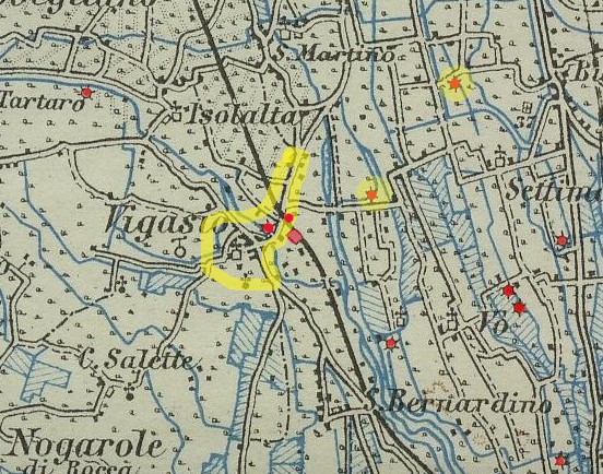 Spurensuche auf dem Land. Wir fuhren nach Vigasio um zu sehen, was noch von den ehemaligen Stellungen, Werke oder Schanzen übrig geblieben ist. Nicht einfach, da jede käufliche Karte die kleinen Straßen nicht eingezeichnet hat. Die jetzigen Ortschaften oft kein Namensschild am Eingang haben und da die Orte inzwischen gewachsen sind, wie die gelbe Umrandung von Vigasio zeigt, ist eine genaue Orientierung sehr schwer.