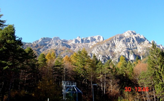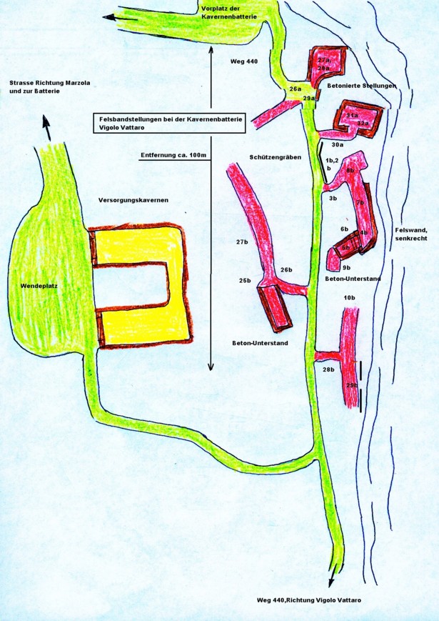 ...von der "evt. Feindseite " her gesehen, das Foto wurde aufgenommen am Ristorante Sintech kurz vor dem Fricca-Pass. Dort isst man hervorragend. Wie man sieht, der Vigolana von der Seite ist so gut wie sturmfrei, dort läuft dort eine Verteidigungslinie über den Grat bis runter nach Caldonazzo. |