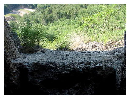 die 3. kleine Stellung, deutlich zu sehen noch links unten der Abdruck des Stahlbandes am Betonsockel. Diese Art der Befestigung hatten die Lafetten der 6cm/M99 Kanone zum Beispiel