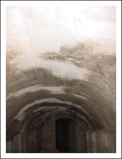 Auch hier die Abdrücke der Schalung, in allen Rundbögen war allerdings Rundstahl eingelegt, also Ausführung in Stahlbeton. Die Betondecken zeigen nach nunmehr fast 90 Jahren nicht die geringsten Risse