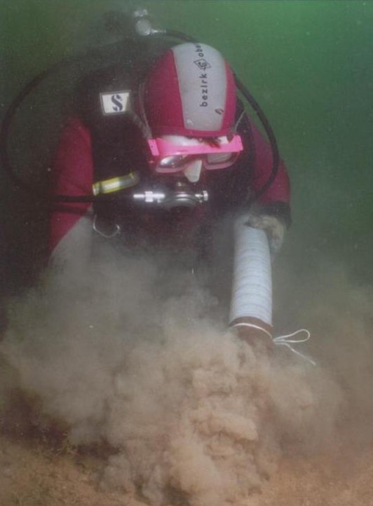 Mit einem speziell hergerichteten, kleinen Saugbagger arbeiteten wir uns dann vorsichtig in die Tiefe, wobei alle anfallenden Leerschalen in dem Areal belassen wurden :