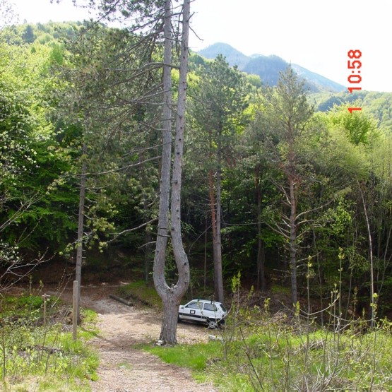 Hinter dem interessant gewachsenen Baum steht der Dienstwagen, rechts von ihm kommt die bereits vollständig instand gesetzte Armierungsstraße von Mattarello , im Hintergrund geht links die Armierungsstraße ins Valsorda ab, rechts geht die Armierungsstraße weiter zum Stützpunkt Malgheta auf den Vigolana und in Richtung Batterie Vignale (Gruppe Ondertoller). Alle Straßen sind top in Ordnung, die Forstverwaltung investiert viel Zeit und Geld, die alten KuK Armierungswege wieder komplett herzustellen, stellenweise zu verbreitern. Ich stehe vor der Batterie Dos Fornas, der Weg vor mir ist der alte Batterieweg, der demnächst wieder mit Naturstein eingefasst wird. Nach und nach entsteht die Festung Trient neu, es will noch viele Jahre, aber inzwischen ist der Wille eindeutig ersichtlich. Das ist doch ein schöner Erfolg, oder? VJ