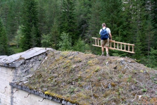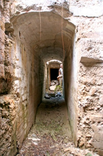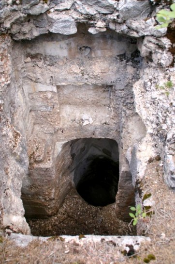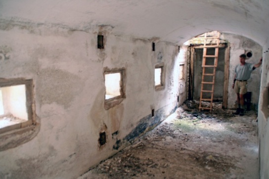 von Sept. 2005 zeigt den Blick vom Dach (2.Stock) der Haubitzbatterie, hinunter zum Schacht der Wendeltreppe die das Erdgeschoss (Küche#7) mit dem 1.Stock (Belagskasematte #35) verband. (auf der südl.Seite des Werkes)