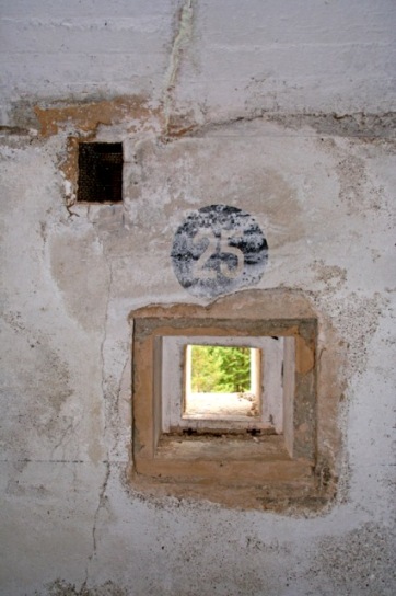 beim hinab steigen in den Gang des 2.Stocks vorm Bereitschaftsraum (#49) Blickrichtung Süden Blick durch den Gang von der südöstlichen Ecke der Halle zw. Bereitschaftsraum und der langen Halle unter den Maschienengewehrpanzerstände #46 und dem Munitionshandmagazin (#48) Blickrichtung: Süden Direkt zur Rechten des Fotographen das obere Ende der Wendeltreppe. Blick im Bereitschaftsraum (#49) hinter mir das Munitionshandmagazin für Lokal No.51 und dem Mitrailleusenstand No 34 (auf den Plan mit 50/51 markiert). Blickrichtung: Norden Eine der Gewehrschießscharten, durch die westlichen Wand des Bereitschaftsraum. Blickrichtung: Westen